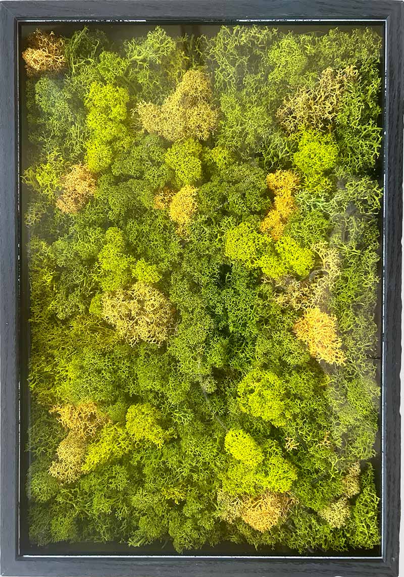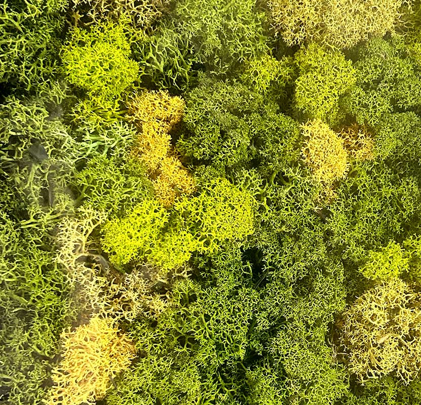 – Musgo finlandés estabilizado: seleccionado en tonos verdes y matices amarillos. El musgo finlandés se caracteriza por su textura suave y esponjosa, su capacidad de mantener el color natural durante años y su resistencia sin necesidad de riego ni cuidados.