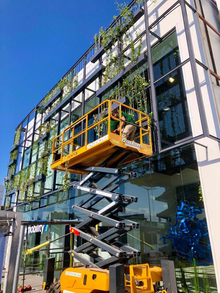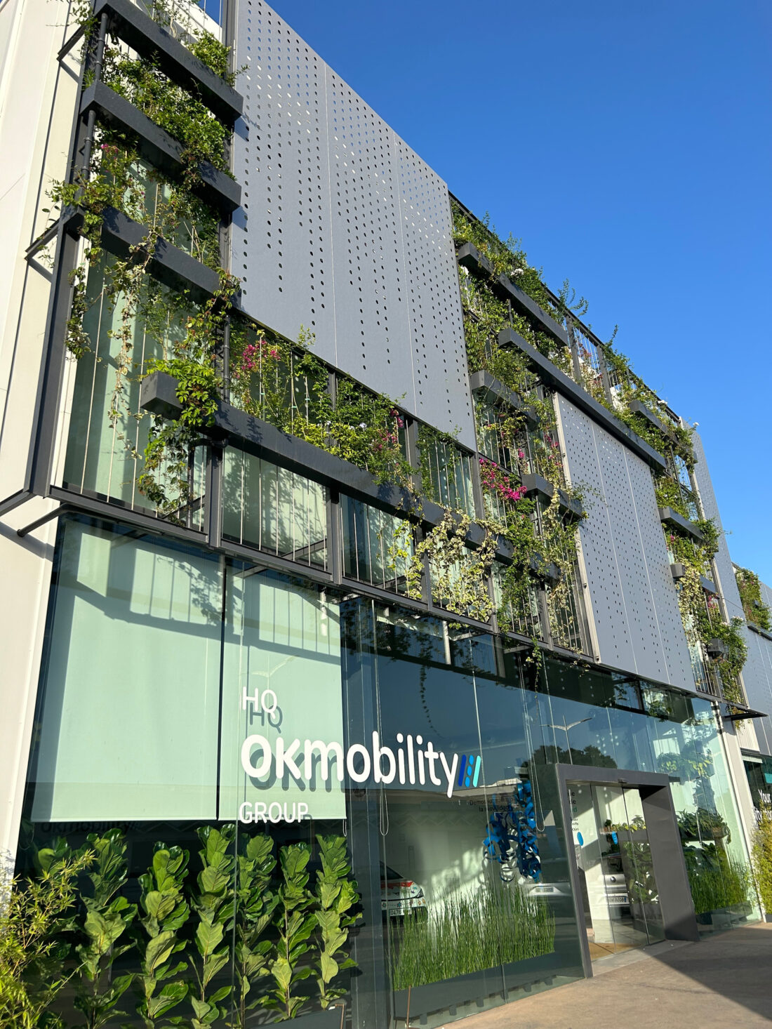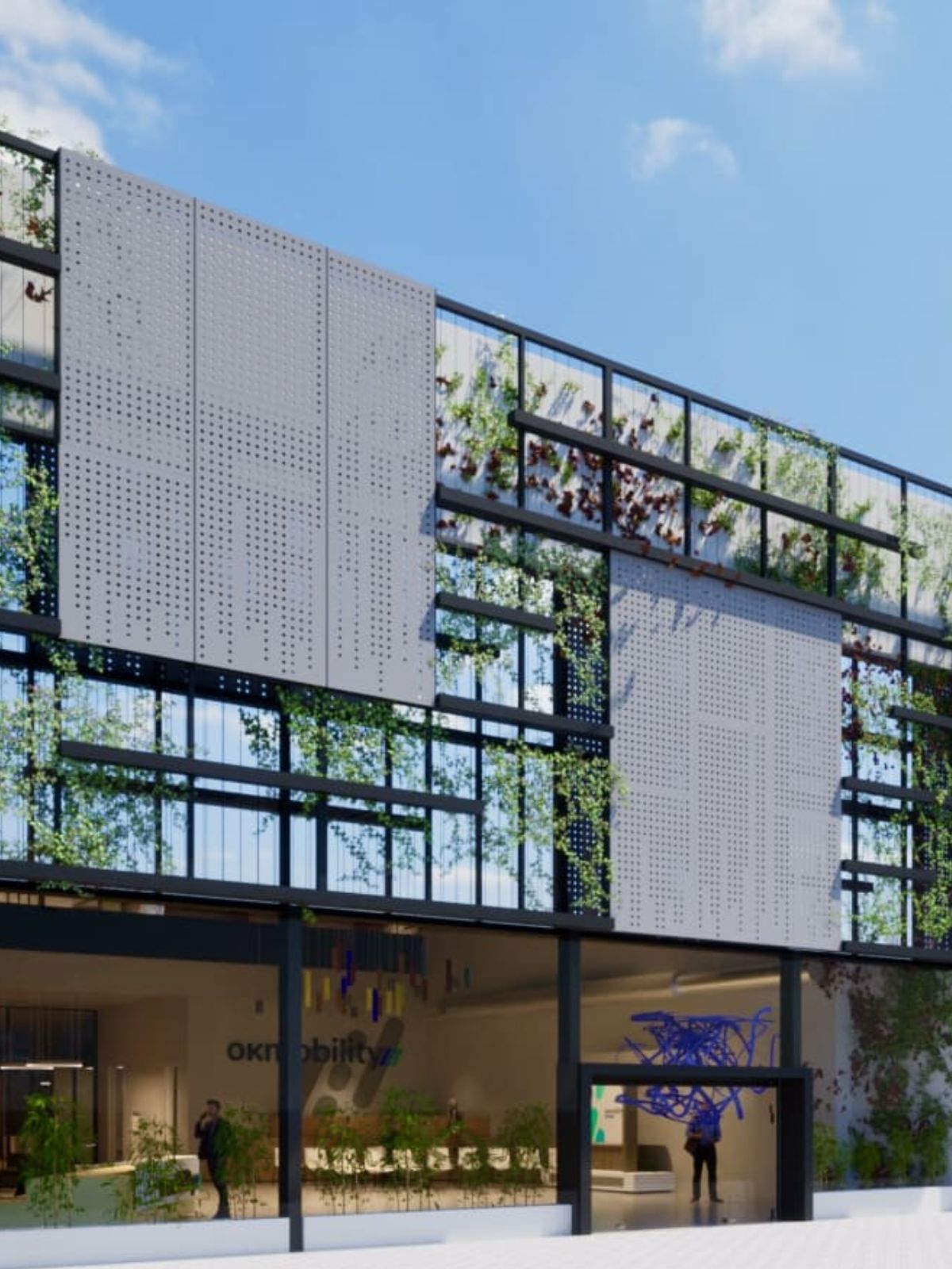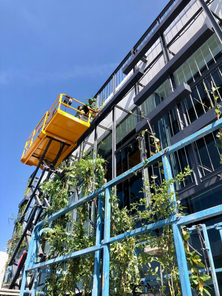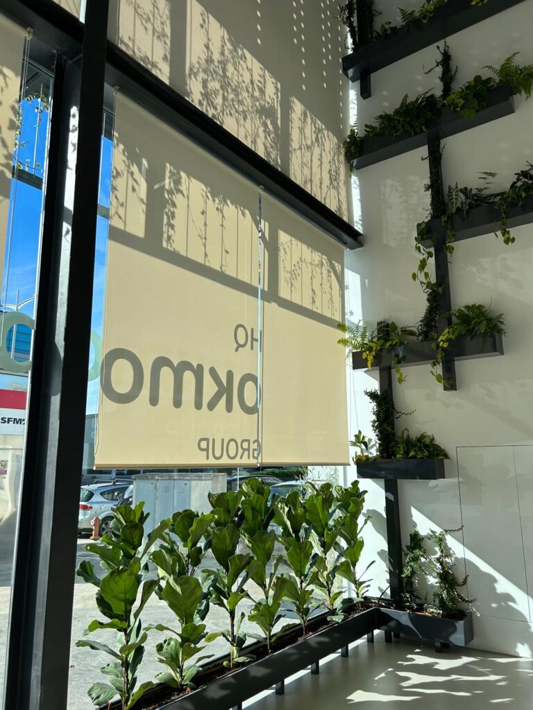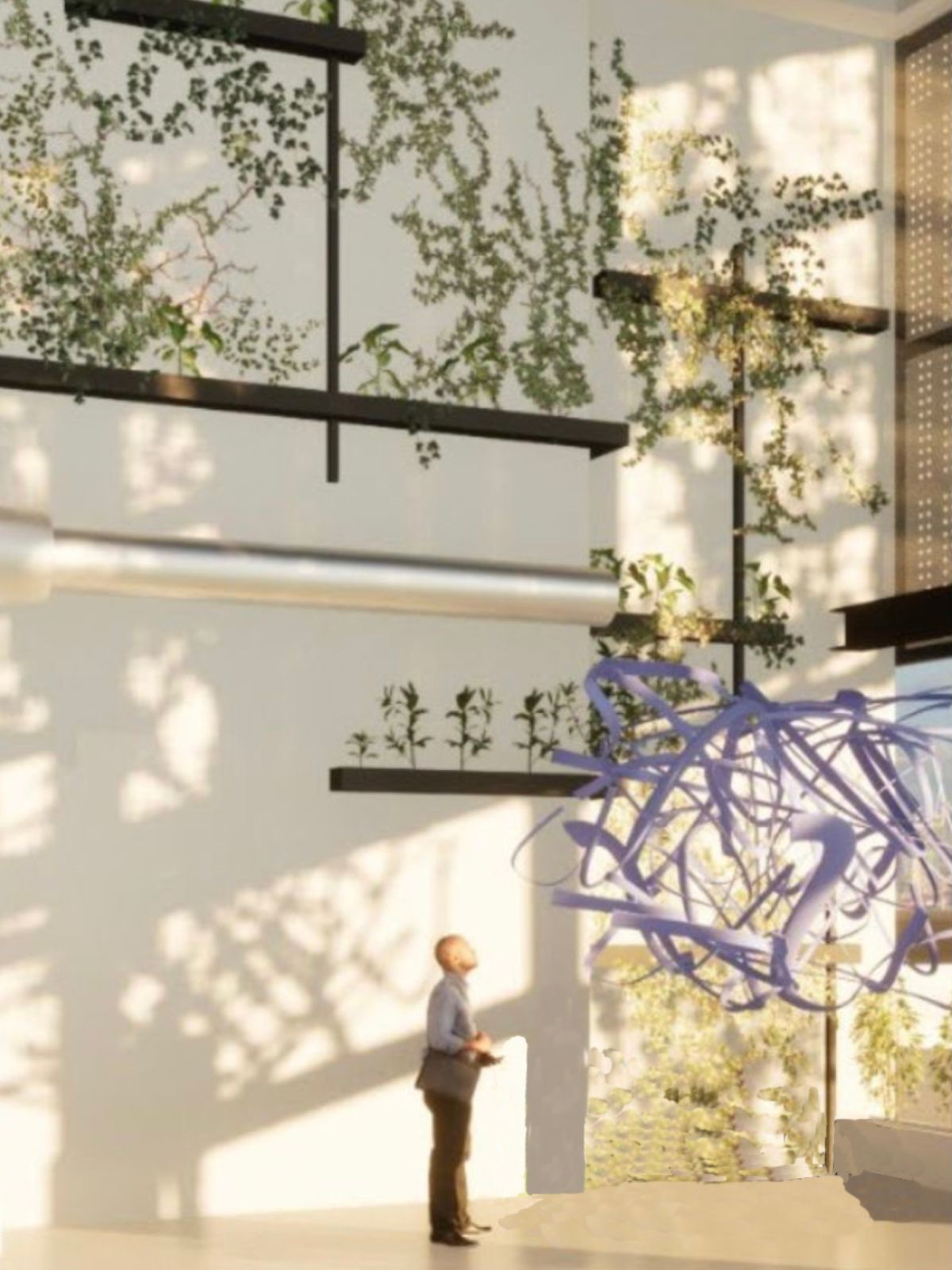 La propuesta del proyecto consiste en dos jardines verticales con diferentes estructuras geométricas, tanto en el interior como en el exterior, en combinación con el espacio. Mediante elementos vanguardistas, la estética del diseño se centra en una celosía vegetal a lo largo de toda la fachada exterior: los haces de luz entran en el espacio interior y consiguen un efecto de luz selvática.